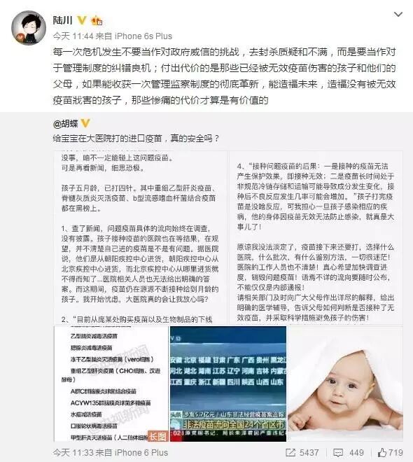 3月21日晚上,导演陆川也发微博讲述自己的儿子也有打疫苗,“球队打个架能上好几天头条!!!有没有人关心疫苗问题???必须公布五亿元无效疫苗流向,疫苗都给哪些孩子打了?还有多少留在医院里?必须查的清清楚楚!!!请给公众交代个明明白白!!!请转发,关注孩子们的未来!!!我儿子在过去几个月里打了三次疫苗,”并配上了心碎的表情。