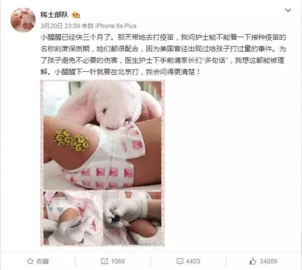 此后又发图文表示带宝宝小醒醒打疫苗,还晒出了宝宝打疫苗的照片,并提醒妈妈们要在打疫苗前仔细确认,避免不必要的伤害。