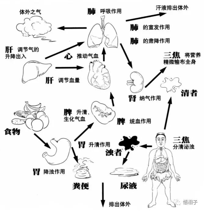 饮入于胃,游溢精气,上输于脾,脾气散精,上归于肺(水饮入胃,先输于脾,是以中焦如沤也。脾气散精,朝于肺部,象地气上升而蒸为云雾,是以上焦如雾也),通调水道,下输膀胱(肺气营运,水随而注,故通调水道,下输膀胱,是以下焦如渎也。若气不能下化,则小便不通,故曰膀胱者,州都之官,津液藏焉,气化则能出矣)。水精四布,五经并行,合于四时五脏阴阳,揆度以为常也(脉化气以行水,分布于四脏,则五脏并行矣。合于四时者,上输象春夏之升,下输象秋冬之降也。五脏阴阳者,即散精、淫精、输精是也。如是则不愆于道揆法度矣,故以为常也)。