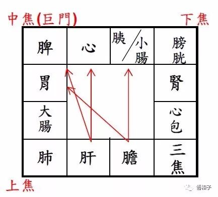 三焦者,中渎之府也,水道出焉,属膀胱,是孤之府也(中渎者,身中之沟渎也。水之入于口而出于便者,必历三焦,故曰中渎之府,水道出焉。在本篇曰属膀胱,在《血气形志篇》曰少阳与心主为表里,盖在下者为阴,属膀胱而合肾水,在上者为阳,合胞络而通心火,三焦所以际上极下,象同六合,而无所不包也。十二脏中惟三焦独大,诸脏无与匹者,故称孤府。 《灵枢》曰∶密理浓皮者,三焦浓。粗理薄皮者,三焦薄。又曰∶勇士者,三焦理横。怯士者,其焦理纵。又曰∶上焦出于胃上口,并咽以上贯膈而布胸中。中焦亦并胃中,出上焦之后,泌糟粕,蒸精液,化精微而为血。下焦者,别回肠,注于膀胱而渗入焉,水谷者,居于胃中,成糟粕,下大肠而成下焦。又曰∶上焦如雾,中焦如沤,下焦如渎。既曰无形,何以有浓薄,何以有纵有横,何以如雾如沤如渎,何以有气血之别耶)。
