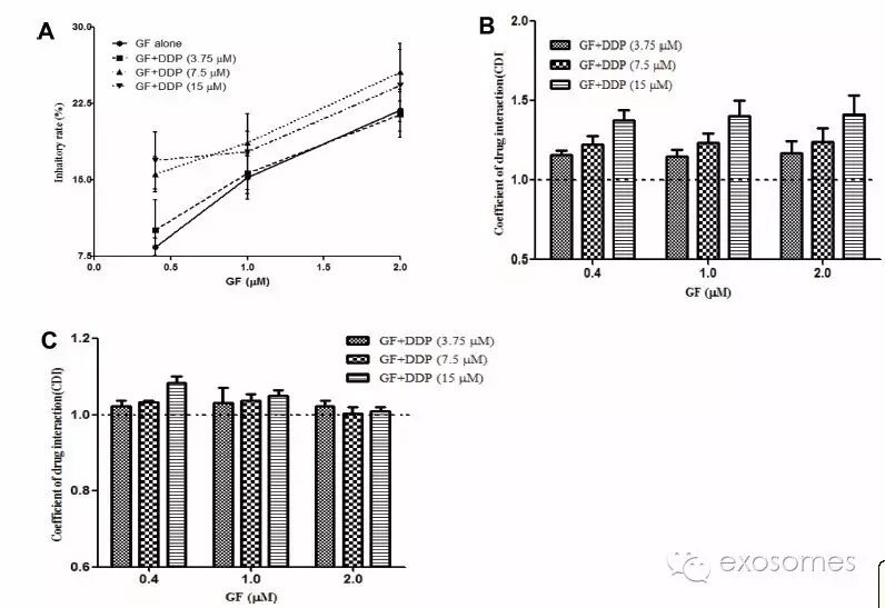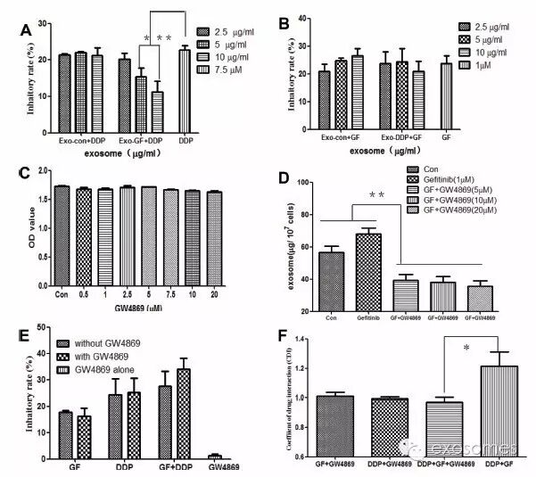 分别用单独、联合(不同浓度)方式处理PC9,检测Exosomes的数量,发现联合的分泌外泌体抗细胞增值能力比单独方式(单独使用吉非替尼、顺铂)处理要弱,再使用GW4869(抑制细胞分泌Exosomes),发现细胞分泌Exosomes的数量减少,同时抗细胞增值能力增强了。结果如下图: