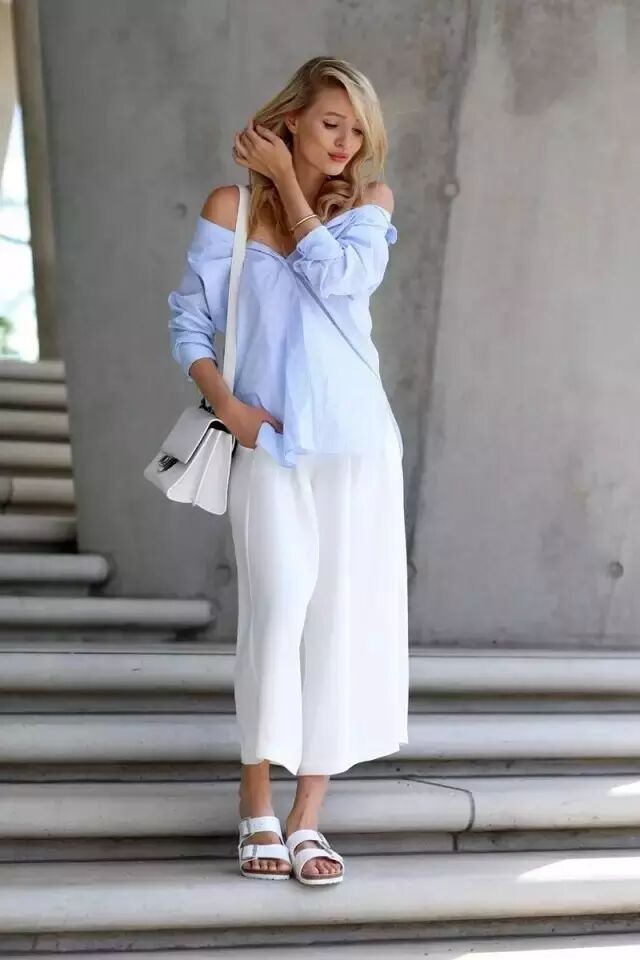 将基础款衬衫靠近领口的几粒纽扣解开,穿成露肩款,也是美得很惊艳哦!