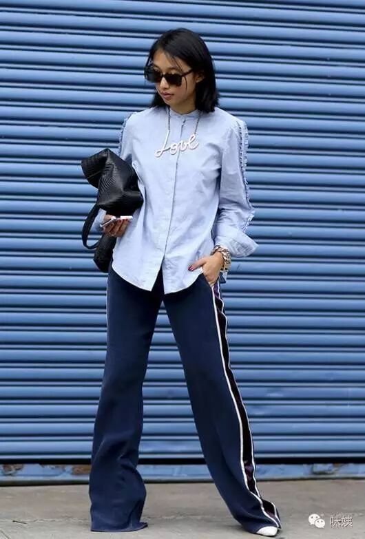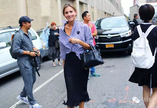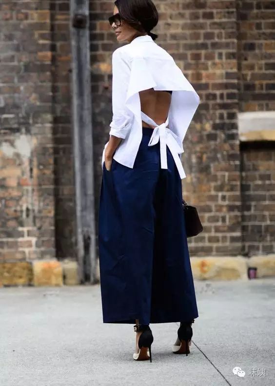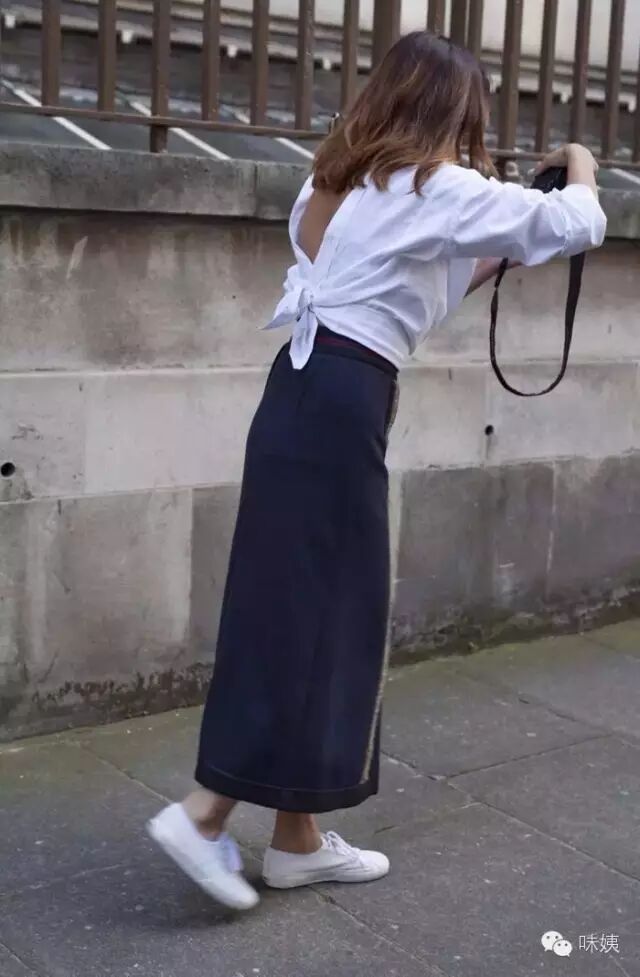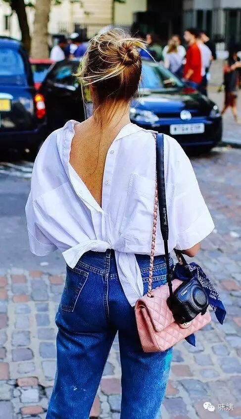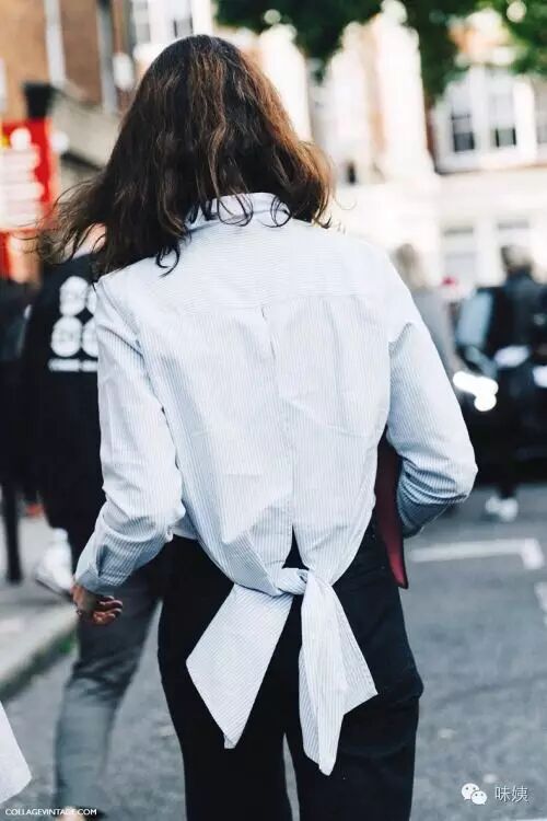 衬衫下摆打结是一个基础的穿搭tip,但是如果打结的位置换成了后背、肩部或者其他位置,这样小小的改变就能增加你的时髦指数。从后面看也是一道靓丽风景~