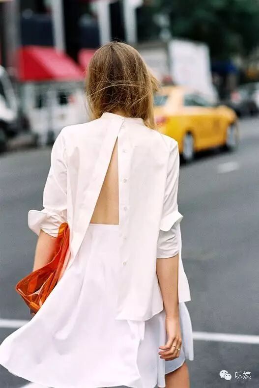 不知道这样穿会不会不舒服,不过时尚圈的人似乎也不care舒适这个问题,所以集好看、性感、时髦于一体的衬衫反穿大法才会如此受人追捧!