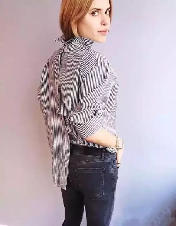 担心衣角打结会把衣服弄皱,把衬衫的一半塞进裤腰里也是时髦的手法,具体步骤参考动图。