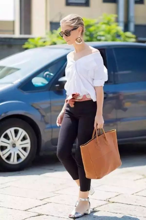 将衬衫前摆扎进下装,后摆随意放下,既能打造休闲潇洒的时髦腔调,又能遮盖不够完美的腰线臀型。