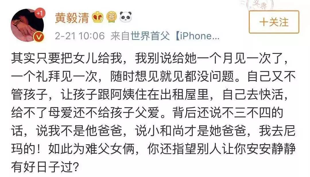 几年里,黄毅清不间断地在微博上抨击污蔑黄奕,说她出轨,说她是同性恋……
