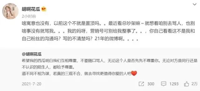 眼看着自己平白无故地被各种曲解,张予曦终于在小号中无奈回应,声明自己的置顶动态并没有什么其他寓意,仅仅是自己奉劝自己的粉丝要保持平和心态,也希望一些对自己出言不逊的网友可以适可而止。
