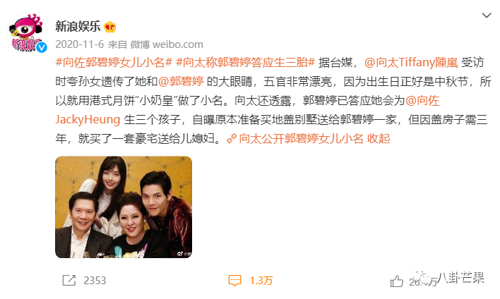 向太说,先前她买了一块地要盖别墅送给郭碧婷一家人,但盖好的话得花3年(虽然没盖,但也算进了12亿通稿里)。