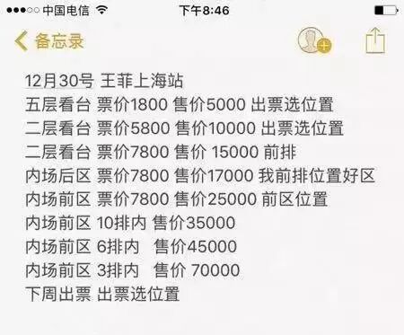 此后,在一些二手票交易平台,以及一些职业黄牛个人的微信朋友圈和淘宝店里,我们会看到王菲演唱会门票价格一路走高,内场从3万、5万、10万,炒到二三十万,最夸张的还有上百万一张;看台5800元的票炒到到一两万,票面最低价1800元的座位也炒到将近一万……我的微信好友有2600多人,其中大部分是中高收入群体,或者说至少是愿意为文艺演出花中高价钱的群体,但是在12月初,我朋友圈里晒演出门票的人微乎其微。