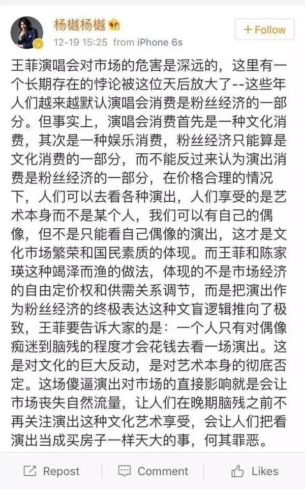 杨樾表示:“王菲演唱会对市场的危害是深远的,这里有一个长期存在的悖论被这位天后放大了——这些年人们越来越默认演唱会消费是粉丝经济的一部分。但事实上,演唱会消费首先是一种文化消费,其次是一种娱乐消费,粉丝经济只能算是文化消费的一部分,而不能反过来认为演出消费是粉丝经济的一部分,在价格合理的情况下,人们可以去看各种演出,人们享受的是艺术本身而不是某个人,我们可以有自己的偶像,但不是只能看自己偶像的演出,这才是文化市场繁荣和国民素质的体现。而这种竭泽而渔的做法,体现的不是市场经济的自由定价权和供需关系调节,而是把演出作为粉丝经济的终极表达这种文盲逻辑推向了极致……这是对文化的巨大反动,是对艺术本身的彻底否定。”