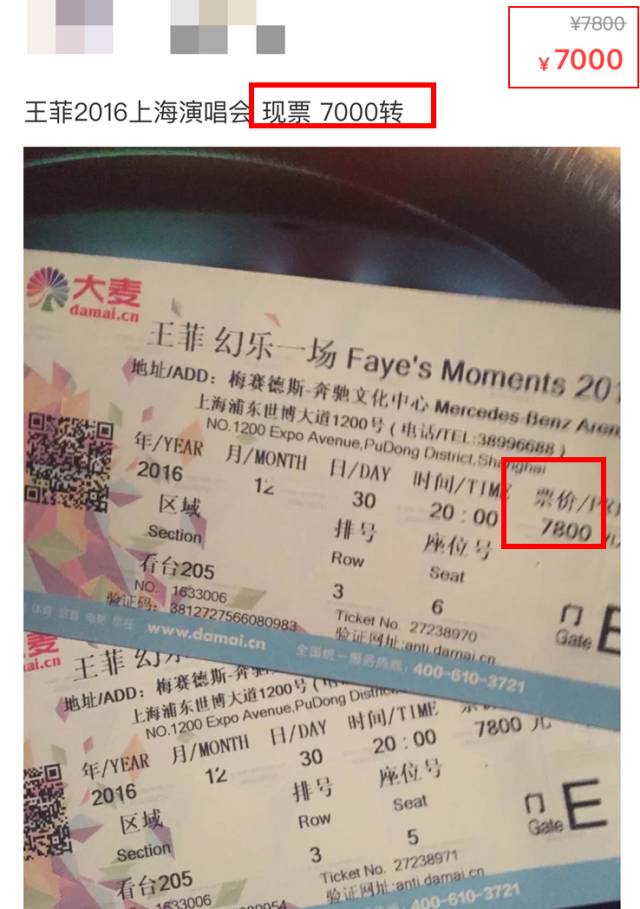 继续沿着“票价”这条线继续往下捋——22日,许多大麦网用户收到了这样的短信,”王菲2016《幻乐一场》上海演唱会现争取到少量5800元、7800元看台门票,如需要请致电10103721订购,数量有限售完即止。”在一些二手票交易网站上,我们还看到了标价7800的门票以7000甚至更低的价格出售。至此,被炒到神话一般的王菲演唱会实际票价,已经跌破票面价格。