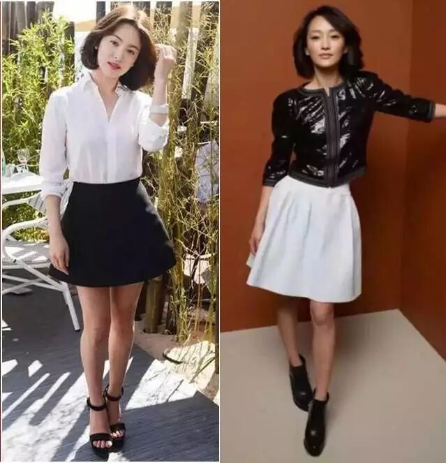 同样都是黑白套装裙,宋慧乔选择穿白衬衫搭黑色A字裙,很收腰又显腿长,周迅穿皮衣搭白裙子,脚上穿的这双短靴真是够显腿短的!