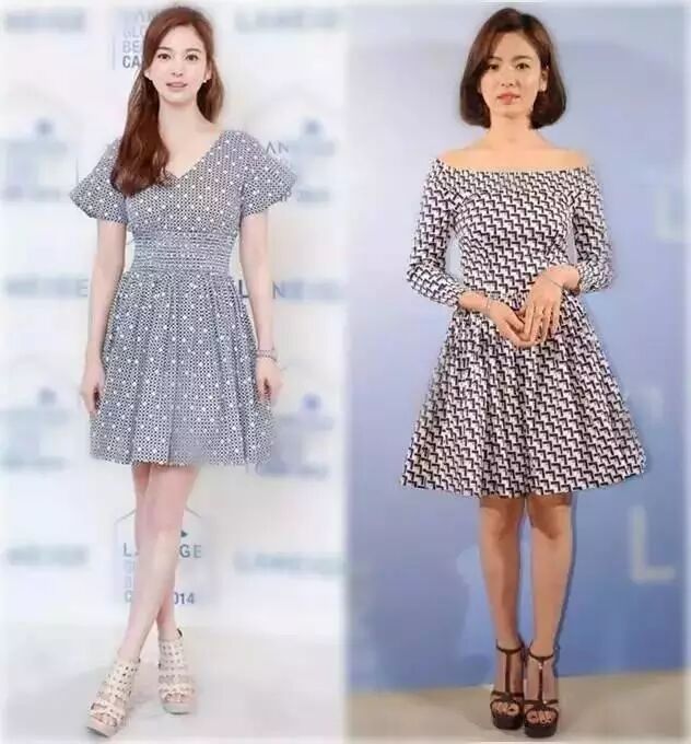 宋慧乔真的很会穿呢,优雅印花公主范,一字领或者是V领的裙装都穿的小性感,及膝的长度优雅的刚刚好!