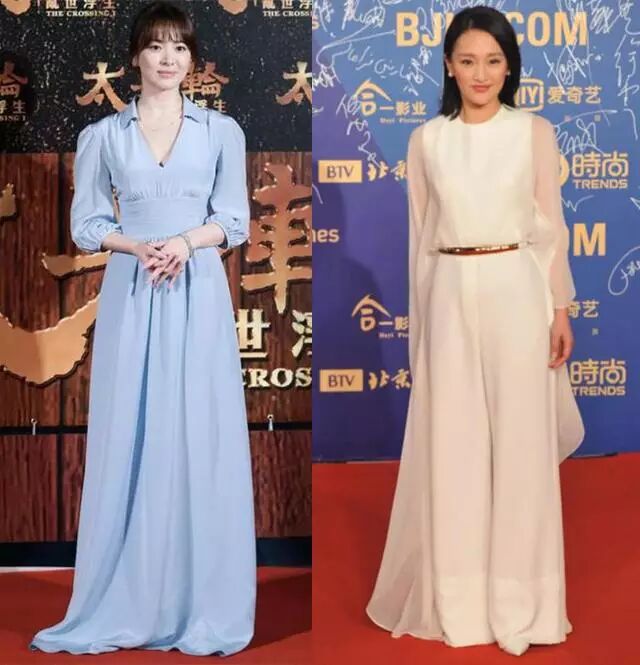 礼裙PK可是差了太多呢,宋慧乔穿一袭深V衬衫裙,超显瘦的,收腰设计做的特别好,腰线很高显得腿很长,周欧迅穿一袭白色网衫裙,圆领系着脖子,一点都不优雅!