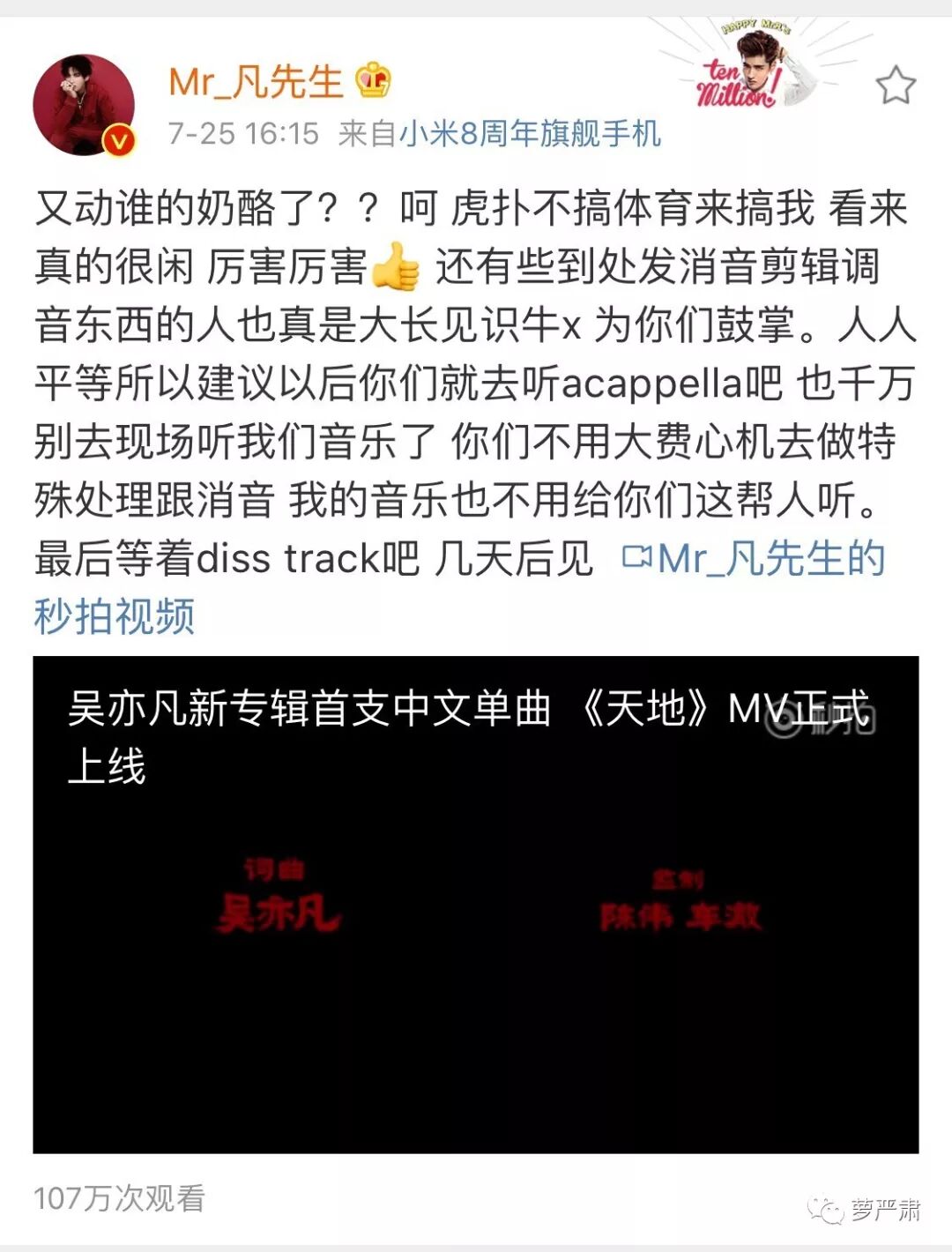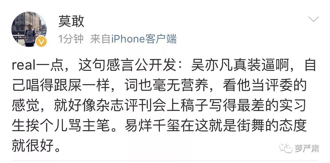 今年直接公开吐槽了:吴亦凡真装X啊,自己唱得跟shit一样,词也毫无营养,当评委仿佛杂志评刊会上稿子写得最差的实习生挨个儿骂主笔。