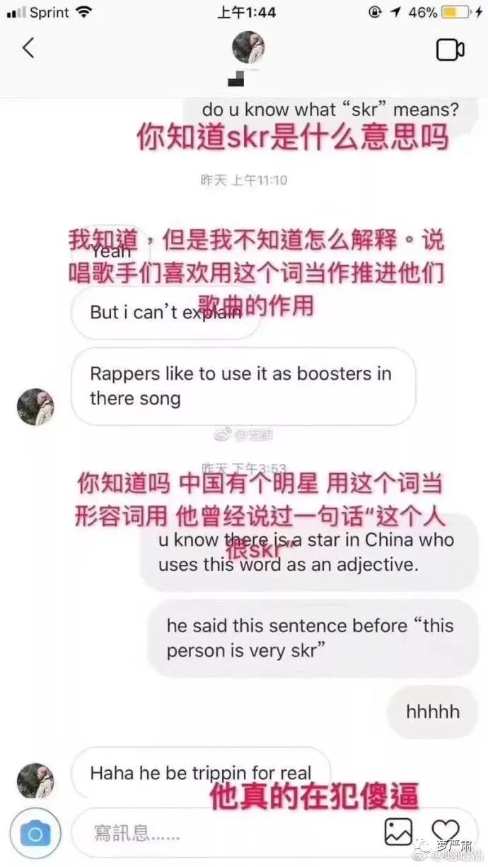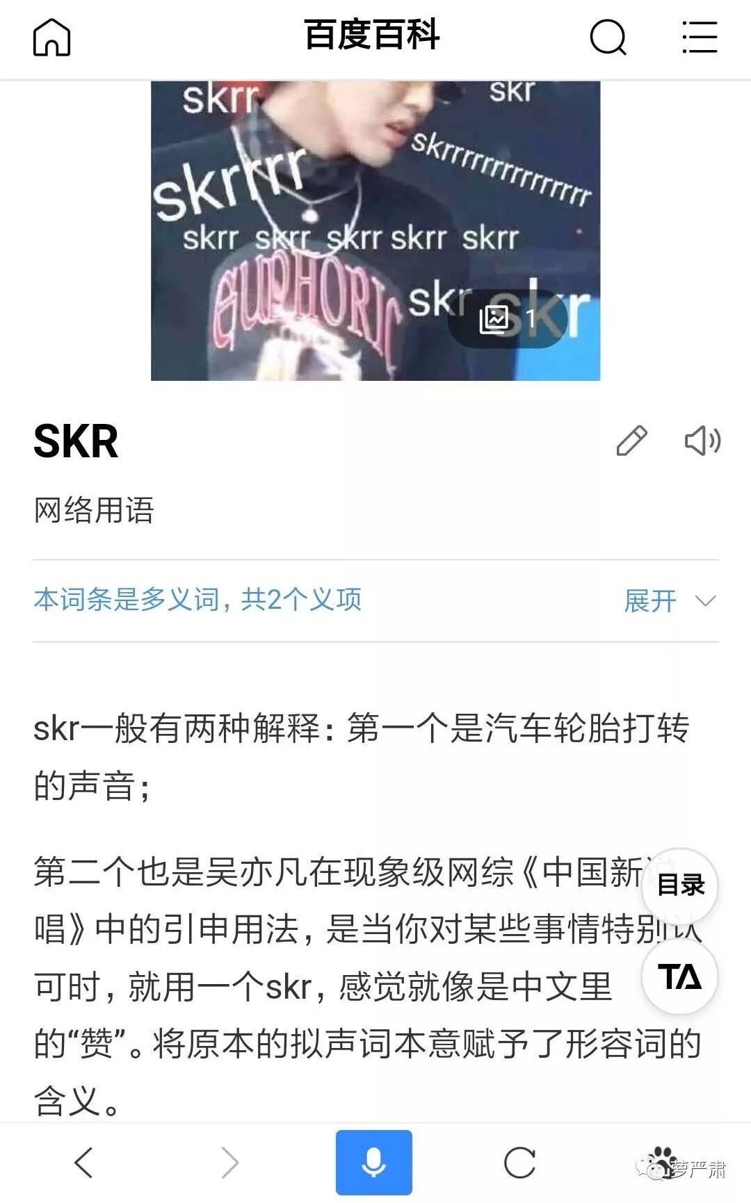 吴亦凡动不动就说「skr」了,还把这个词用成了形容词,「太 skr 了」。