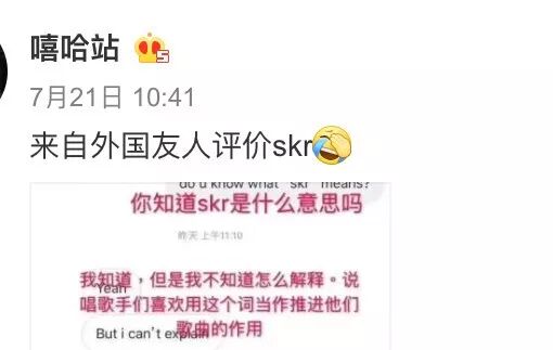 「skr」本来是一个拟声词写作「skrt 」,梗一出来就有懂嘻哈的观众质疑用错了。