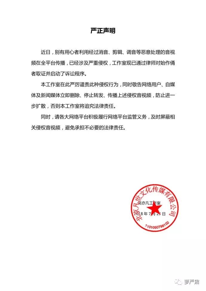 这个时候哐当,吴亦凡工作室的声明来了:说别有用心者利用经过消音剪辑调音等恶意处理的音视频在全平台传播已经涉及侵权,请大家停止传播,发了的也赶紧删。