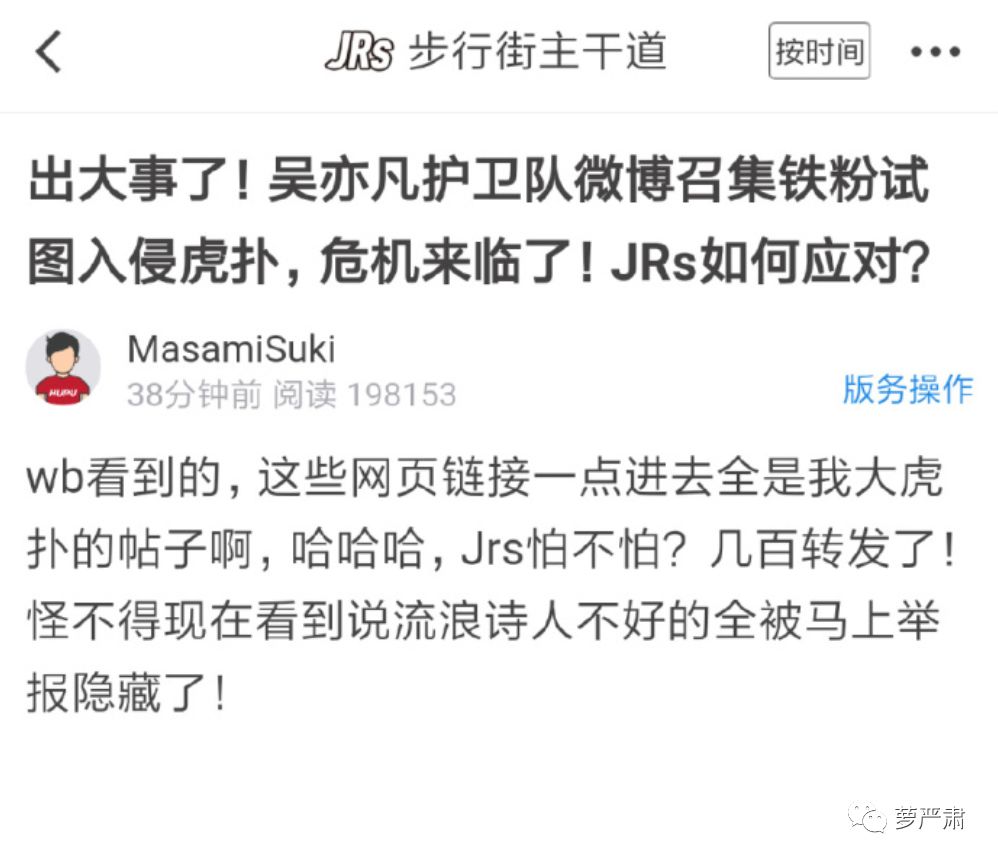 步行街里也发了帖子,把粉丝的几百转发举报微博定性为「吴亦凡护卫队微博召集铁粉试图入侵虎扑」。