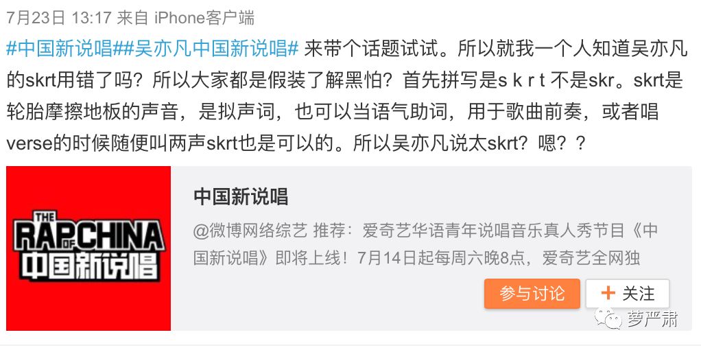 先是吴亦凡一直讲的「skr」(读得快一点发音大概是“死戈”)被质疑用法不对。(这很明显是模仿 freestyle 试图造梗)