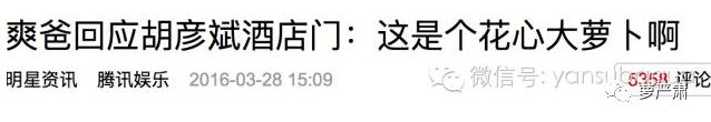 2016年3月,胡彦斌被拍到和美女同入酒店。爽爸就骂胡彦斌是花心大萝卜。