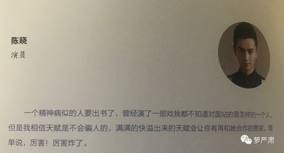 画风特别不一样的是陈晓的留言:“一个精神病似的人要出书了,曾经演了一部戏我都不知道对面站的是怎样的一个人了,但我相信天赋是不会骗人的……”