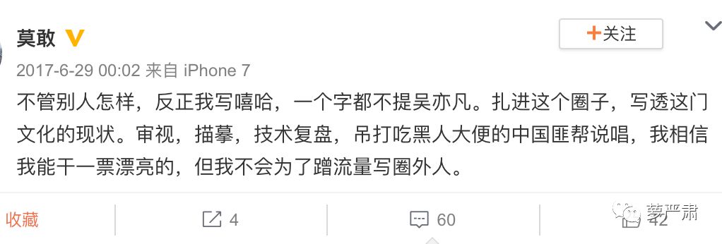 他去年写《有嘻哈》就表示不认为吴亦凡是嘻哈圈内人,一个字也不想带他。