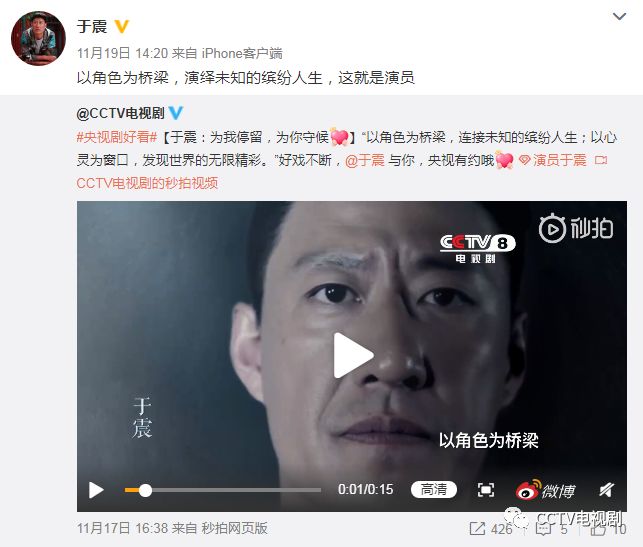 对于外界的如此“定位”,于震自己怎么看呢?最近,他转发了一条“CCTV电视剧”的微博,借着这条由他拍摄的央视八套频道宣传片,他再次发表属于自己的表演感言:“以角色为桥梁,演绎未知的缤纷人生,这就是演员。”