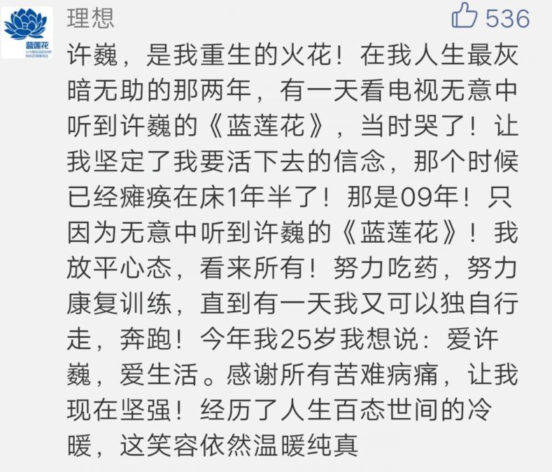 许巍的音乐和故事鼓励我们战胜苦难,他的音乐在无形中给了我们力量、温暖,他是我们的正能量导师。