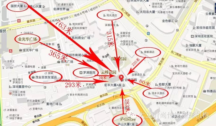 丽都酒店、罗湖医院、鸿丰大酒店、月亮湾休闲会所、阳光酒店、金城大厦、国贸大厦、庐山大厦、金光华广场、