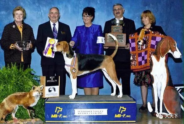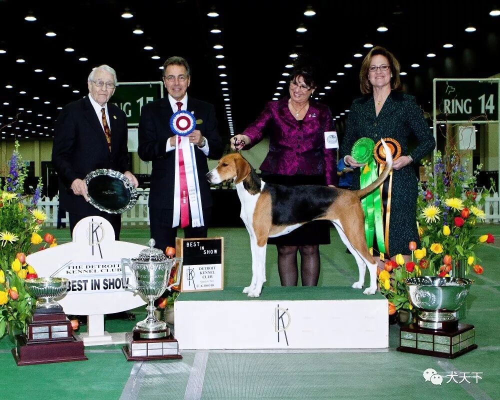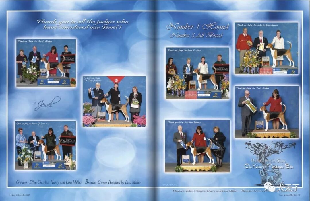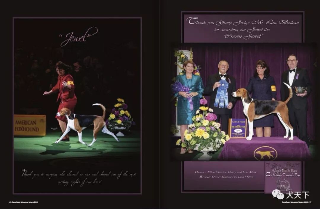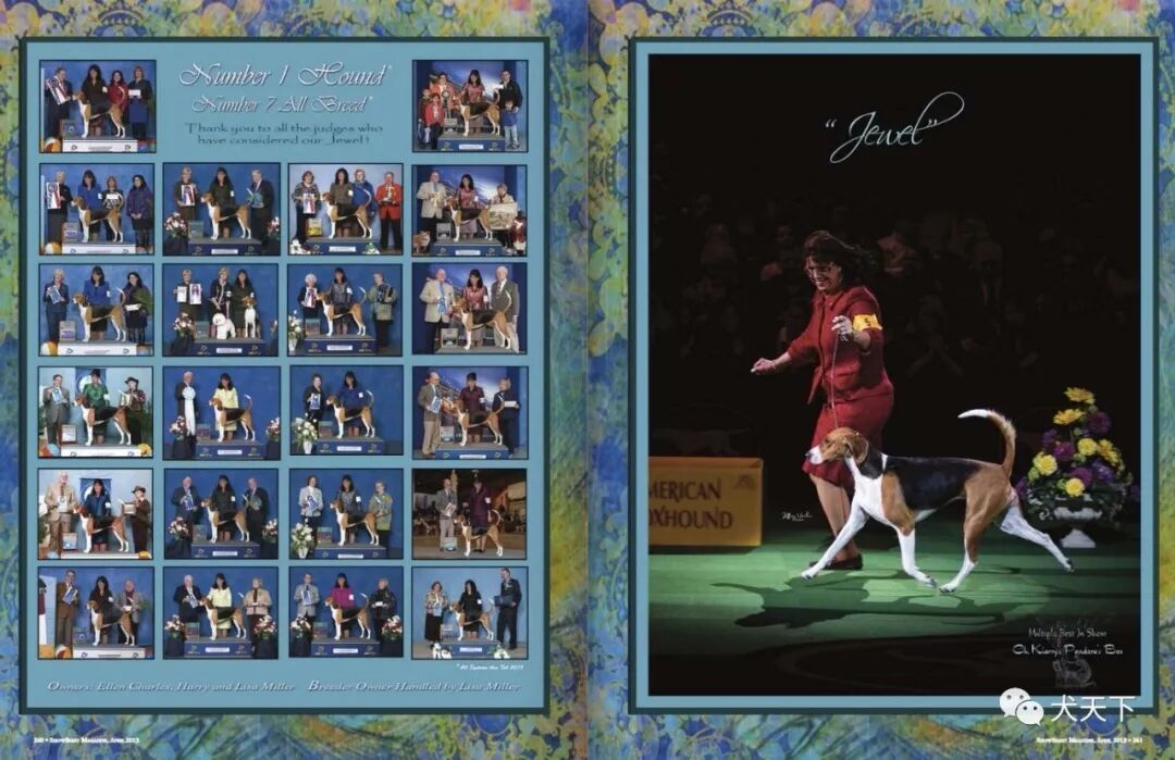 GCH CH Kiarry's Pandora's Box——呼名“Jewel”,来自Kiarry Kennels的杰出美国猎狐母犬,也是近几十年来表现最为出色的一只美国猎狐犬。2013年当时3岁的“Jewel”赢得美国国家展BIS,这是12年来首只猎犬赢得此荣誉,非常地了不起!“Jewel”作为一只顶级猎犬,在美国AKC赛场上的表现非常强势,2012、2013年均拿下三十多场BIS,连续两年霸占着美国AKC美国猎狐犬排行一的宝座,积分遥遥领先。优秀的成绩令各位猎犬组成员望其项背,毫无疑问地拿下猎犬组排行一,并连续两年闯入全犬种排行榜TOP10,分别位列第八位和第六位。这几年各大赛事的获奖者均少不了它的身影,2011年美国国家冠军收获BOS,2012年遗憾缺席,2013年美国国家冠军一鼓作气打败众多好手,一举拿下猎犬组GP1,跻身决赛。美国国家单独展同样表现不俗,2012年将BOB收入囊中。2012、2013年两届西敏寺犬展均斩获BOB、2013年表现更加突出,拿下猎犬组GP1,强势挺进决赛!这只杰出的猎犬凭借着其出色的结构、与众不同的气质、傲人的战绩在AKC赛场留下了完美的足迹!