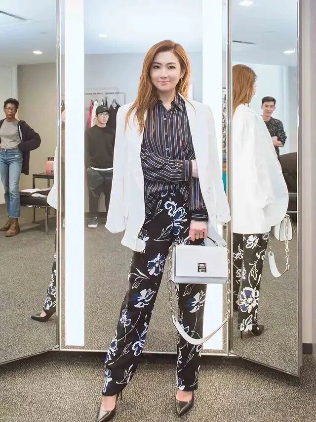 任家萱她内搭上了一条黑色的条纹款衬衫,这种衬衫是比较深的颜色,而他的下半身也选择了一条深颜色的裤子,上面则是印着一朵一朵美丽的花的图案。但是她很聪明,她搭配上了一件白色的小西装,多了一些亮色,就让这一套都不那么沉闷。