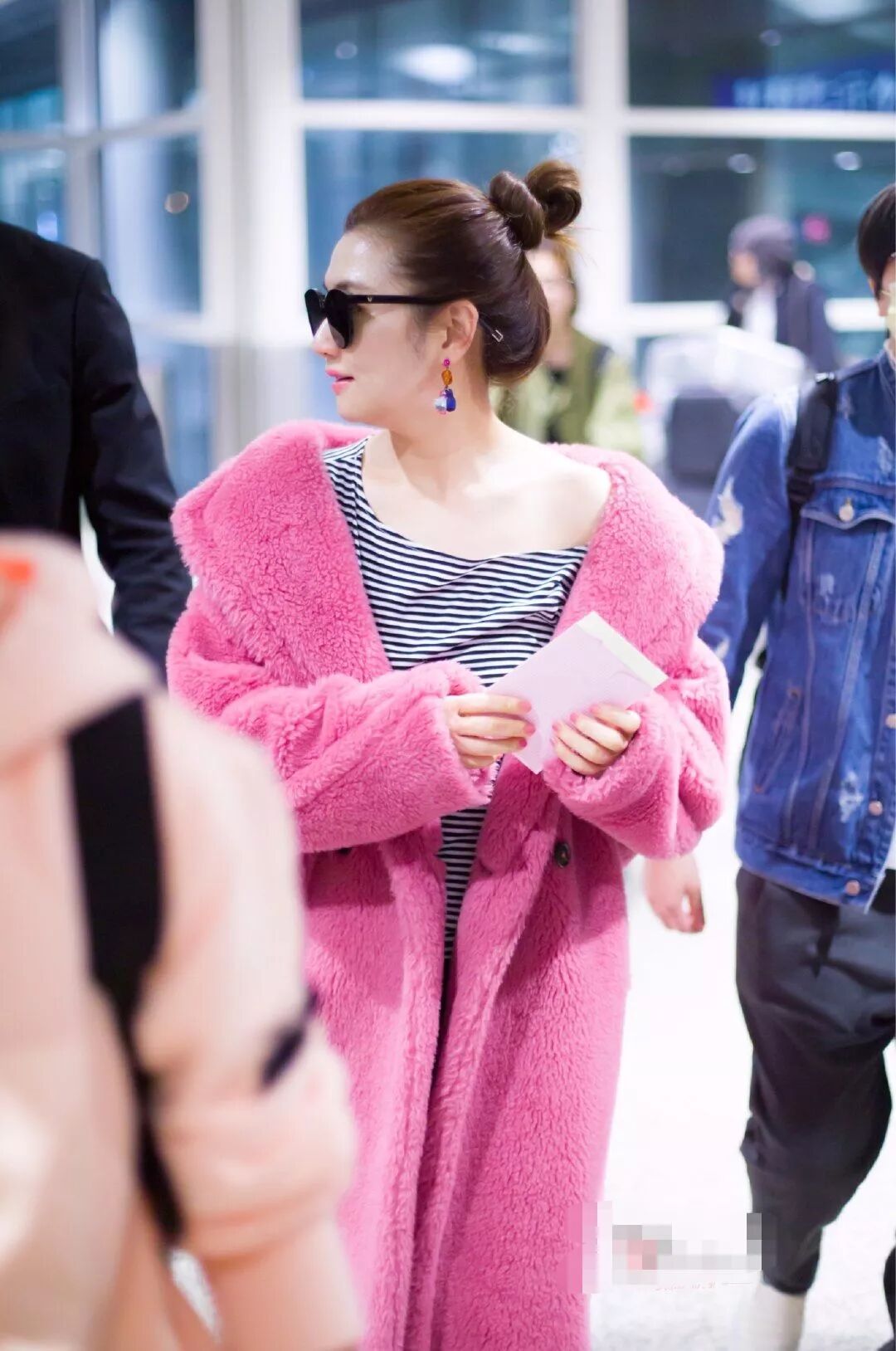 就知道女明星都爱跟潮流,所以呢,自然也不例外,她穿上了一件粉嫩的泰迪熊大衣。这种颜色的衣服让她显得特别的青春又有活力。她的那内搭选择了一件圆领的黑白横条纹T恤,就是横条纹的,真的很显人胖呢。