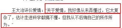 王大治还特别深刻的谈论过爱情这个话题,关于爱情,我好像从未弄懂过,它太复杂了,估计走进科学都搞不懂,但我从不后悔自己的所作所为。