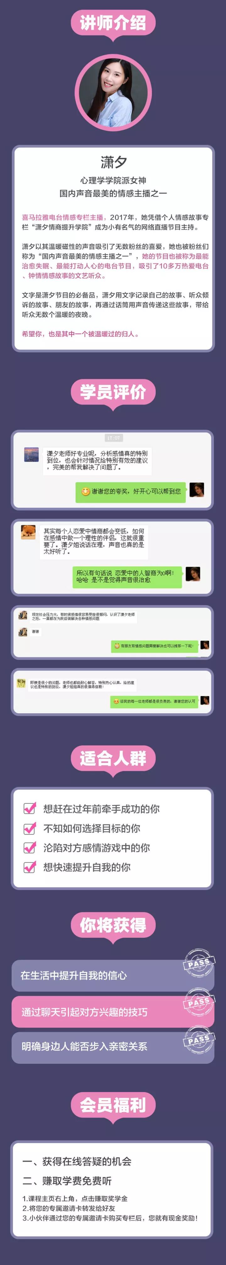 我们特别邀请情感主播潇夕针对女性恋爱技巧开设了10节情感课堂,旨在帮你剖析亲密关系中两性的不同心理状况,在此基础上告诉你如何掌握恋爱的技巧,务求让大家能够快速提升自我,掌握感情主动权,让你得到心目中的美好爱情!