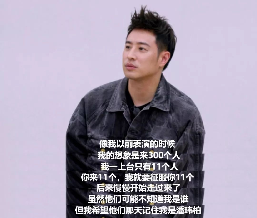 “像我以前表演的时候,我的想象是来300个人,我一上台只有11个人。但是我的想法是,你来11个人,我就要征服你11个人”,潘玮柏甚至分享了自己出道时无人问津的辛酸经历,来告诉学员们,“知道怎么爬起来才是真正的男人”。