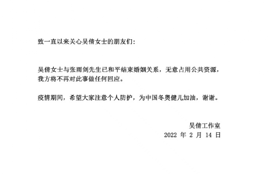 随后,吴倩工作室发布了声明,正式宣告吴倩和张雨剑已经离婚。