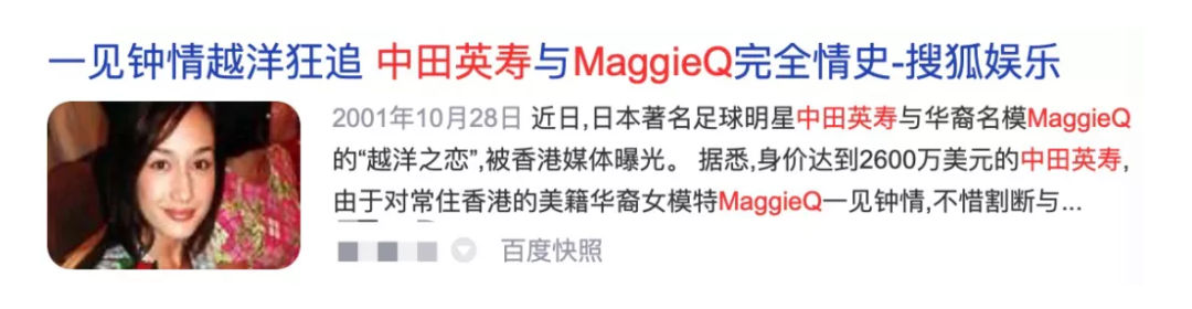 这段绯闻的风头还没过,Maggie Q就和日本国宝级足球巨星中田英寿谈起了跨国恋。