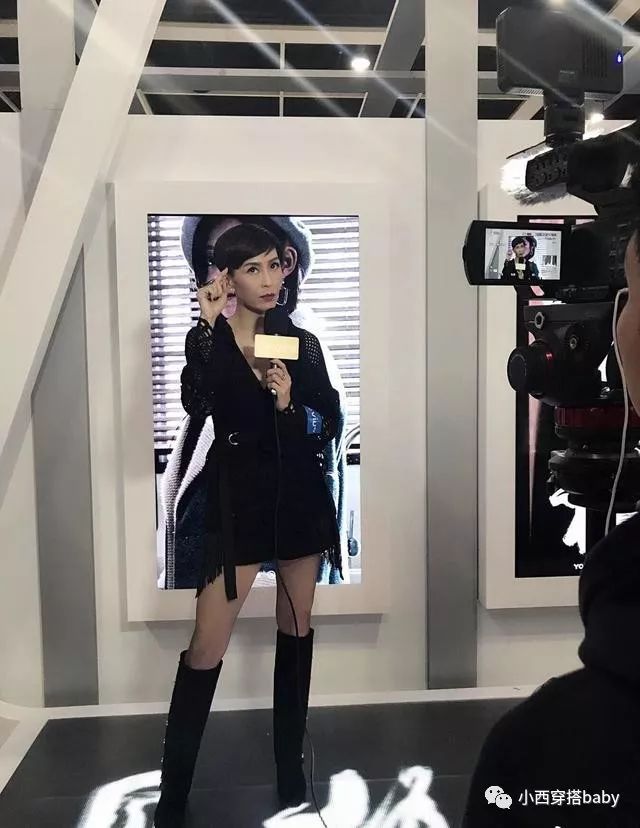 在秋冬季节为自己挑选一双长款的高筒靴,让整个人看上去非常的酷炫。像这样的高筒靴能够显得腿部又细又直,上面搭配短款的服饰,这样整个人就比较的高挑。伍咏薇的这一件连衣裙有网格的造型,增添了一些女人味。
