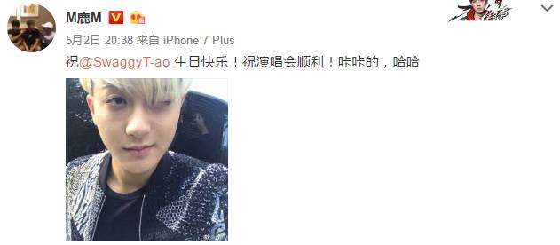 鹿晗发了一张韬韬的自拍,祝他生日快乐。