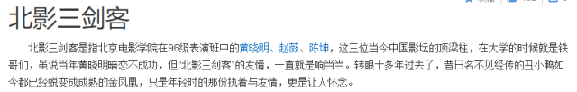 陈坤和黄晓明呢,年轻的时候同样是很好很好的朋友,那时他俩和赵薇一起并称为“北影三剑客”,现在还能找到百度词条的说。