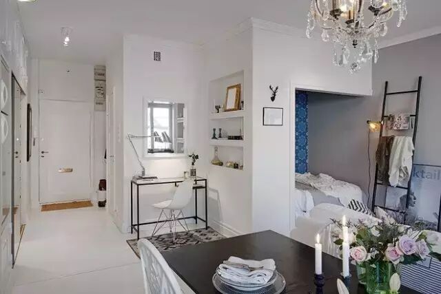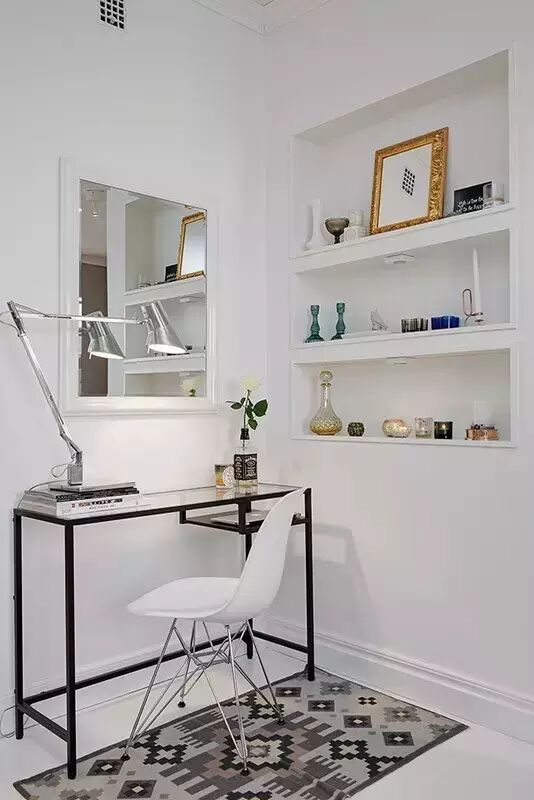 进门处单独设置了一个小小的工作台外加上一面不大的镜子,不仅功能性强又能在视觉上起到拉伸空间的作用。