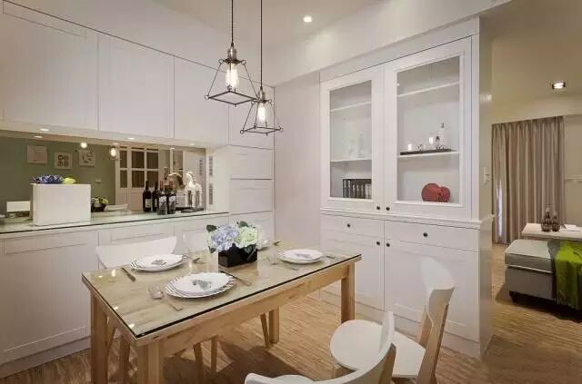 简约的白色柜子也设置了很多储藏柜,原木桌搭配着墙体颜色使整个空间的色彩和谐统一。