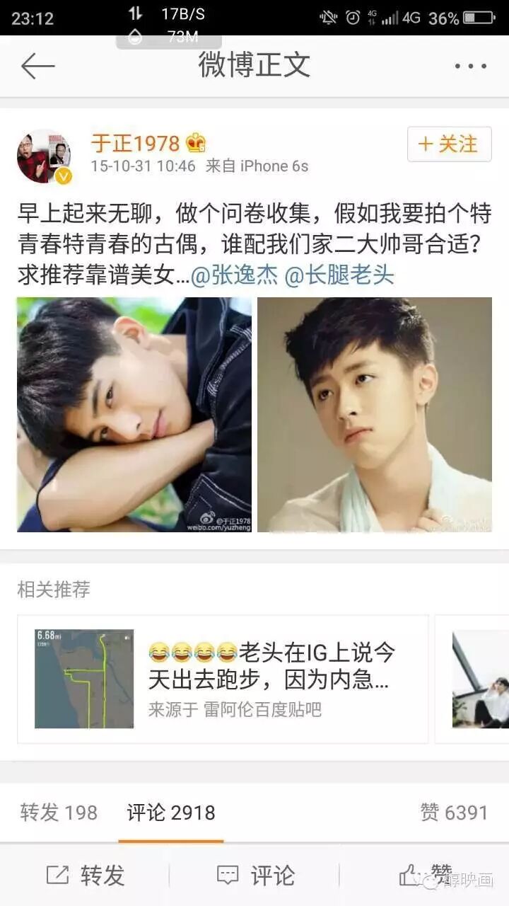 再后来,他就签了于正的公司,于正第一次为宋威龙宣传就是在我拍摄一个月后,用的我这张照片: