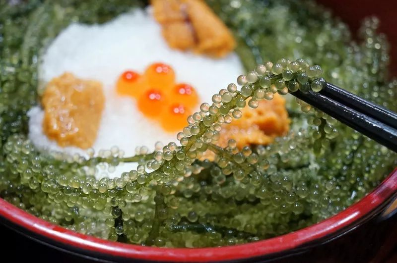 冲绳特产海葡萄。抓一串海葡萄放在嘴里嚼,一粒粒“小葡萄”炸开,感觉很神奇,有点腥,黏黏的,跟葡萄完全不是一个味儿。这种海藻很有营养,号称“植物界的鱼子酱”。