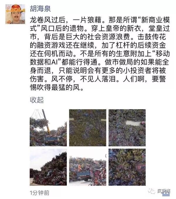 12月18日下午消息,音乐制作人、天使投资人胡海泉发布朋友圈,并配上“厦门10万辆共享单车堆积成山”的照片称,龙卷风过后,一片狼藉。那是所谓“新商业模式”风口后的遗物。穿上皇帝的新衣,堂皇过市,背后是巨大的社会资源浪费。