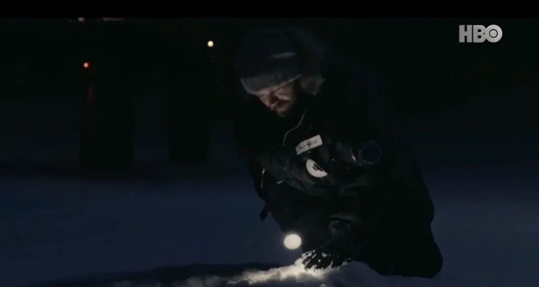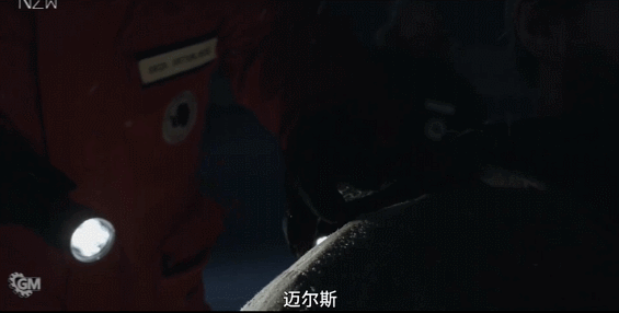 在伸手不见五指的极夜里,多次出现了科考队员拿着手电筒缓慢前行的长镜头。镜头的延伸上移,营造出一种令人窒息的不安,让观众不由自主地跟随主角的步伐,加深了惊悚的观感。