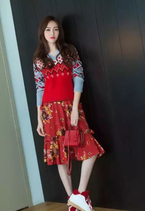 唐嫣同样是选择了一件复古风浓郁的毛衣,红蓝撞色看起来要比黑白活泼不少,再搭配一条红色碎花裙看起来活力满满。