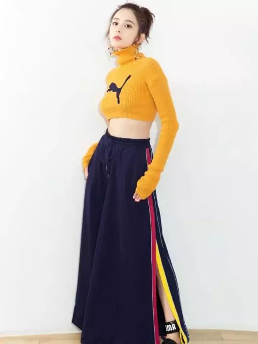 娜扎黄色短款毛衣,比常规款还短了一截,如果是日常穿搭的话还要加件外套会比较合适~